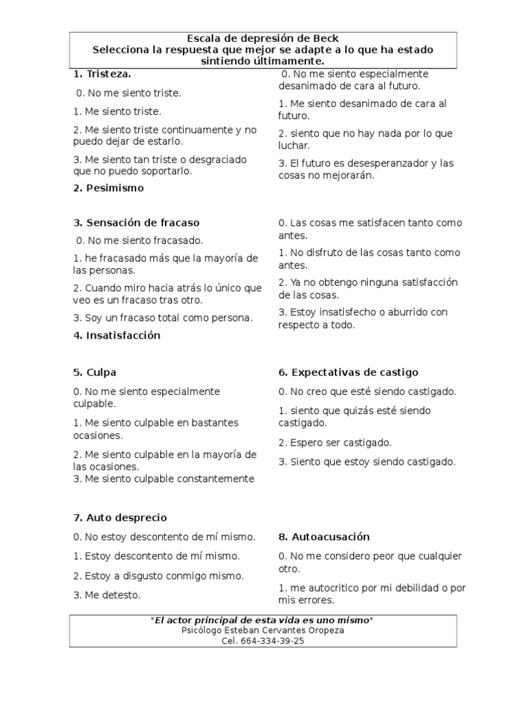 Cuestionario - Aaron Beck | Psicoterapia | Depresión ... from imgv2-2-f.scribdassets.com. Para más información pulse aquí para ir al website. Maybe you would like to learn more about one of these? Check spelling or type a new query. We did not find results for: Cuestionario de depresión de beck.